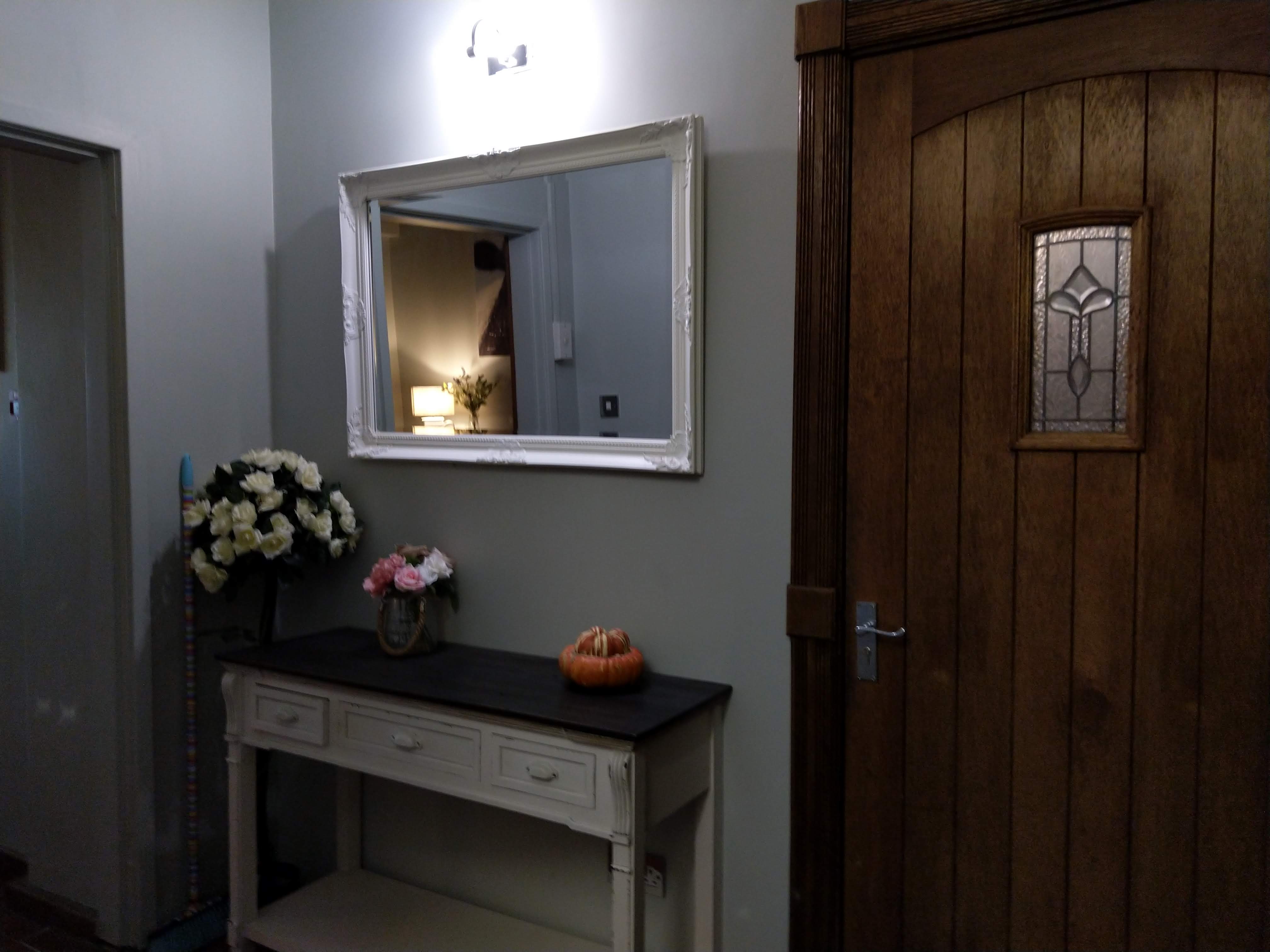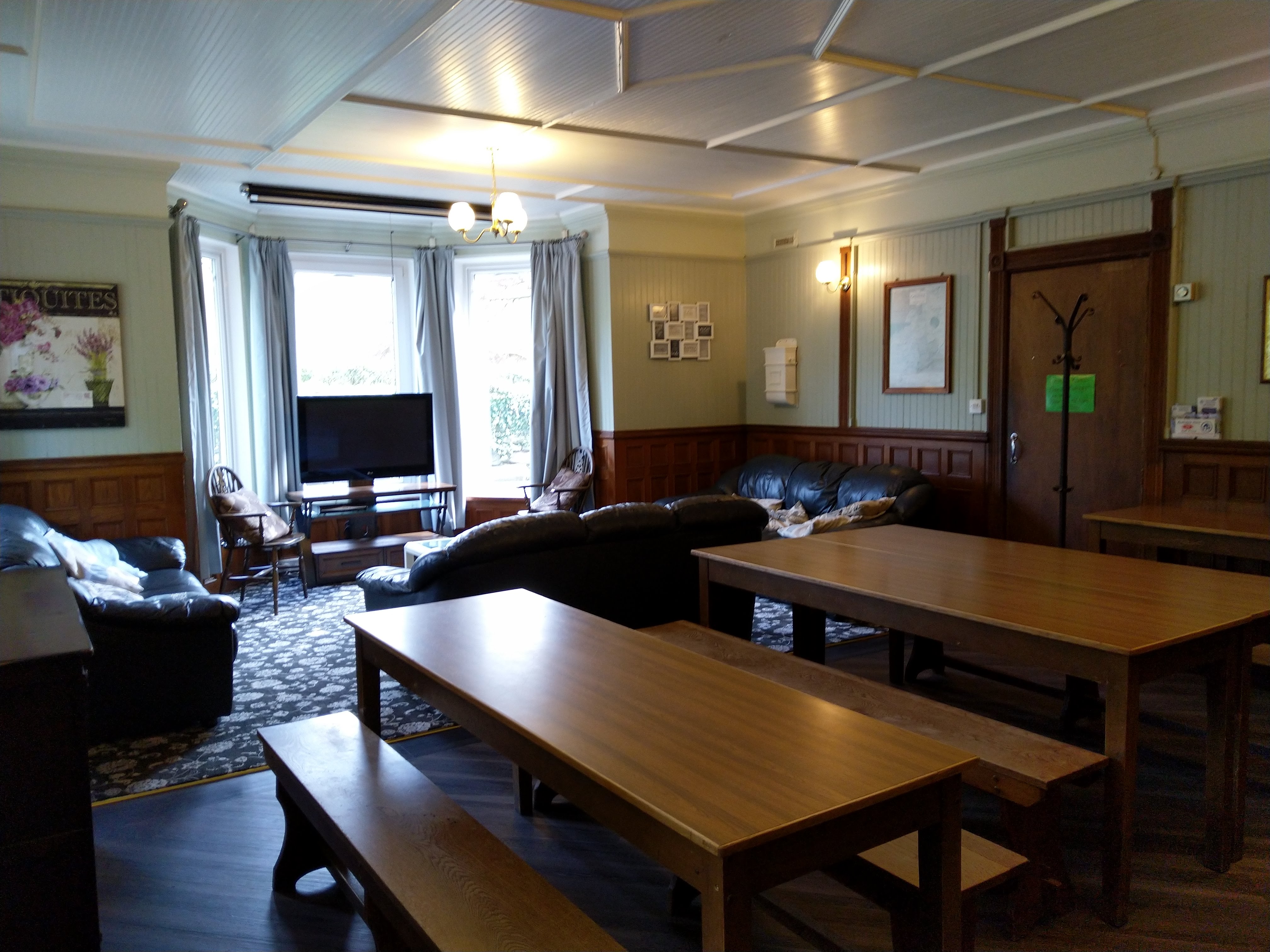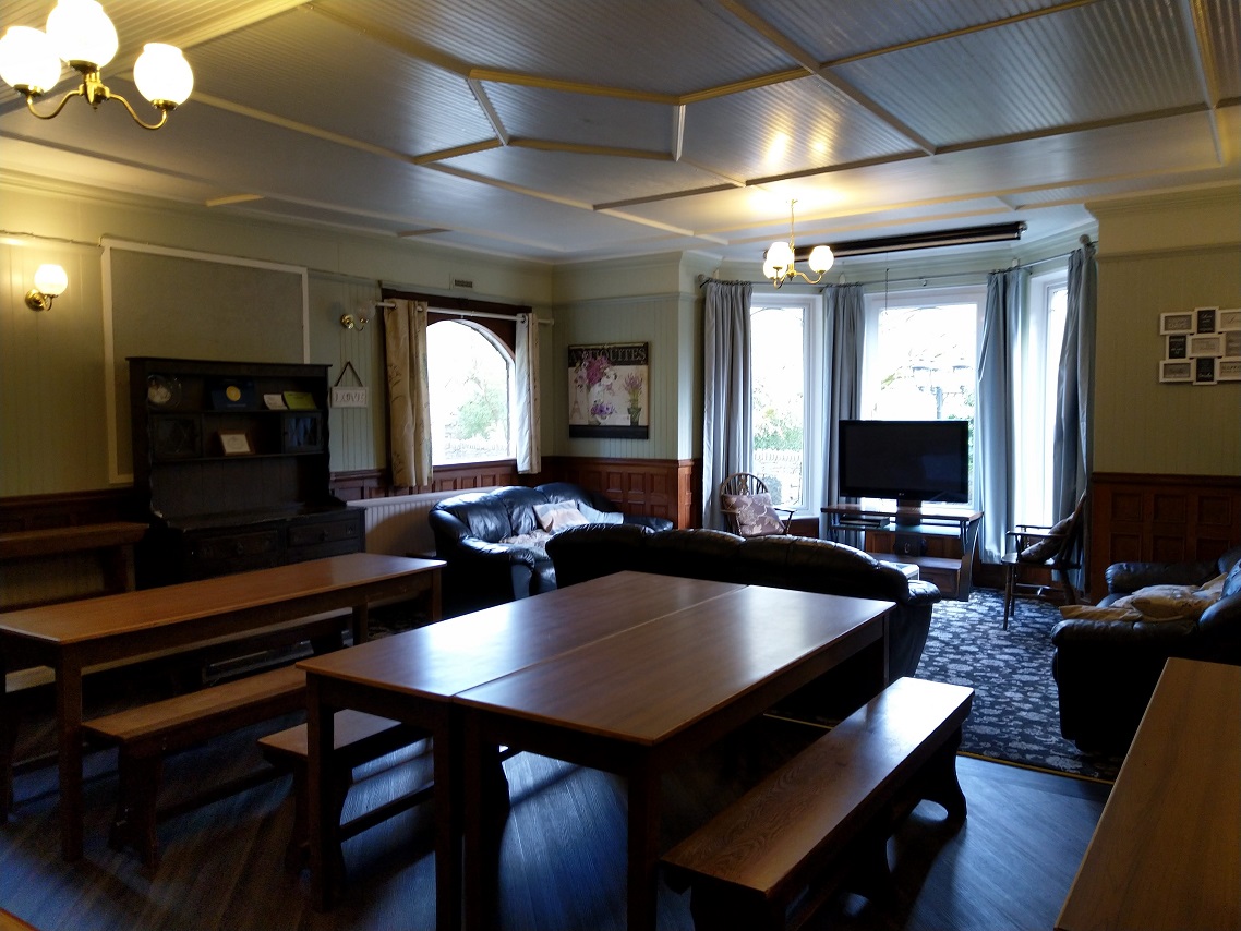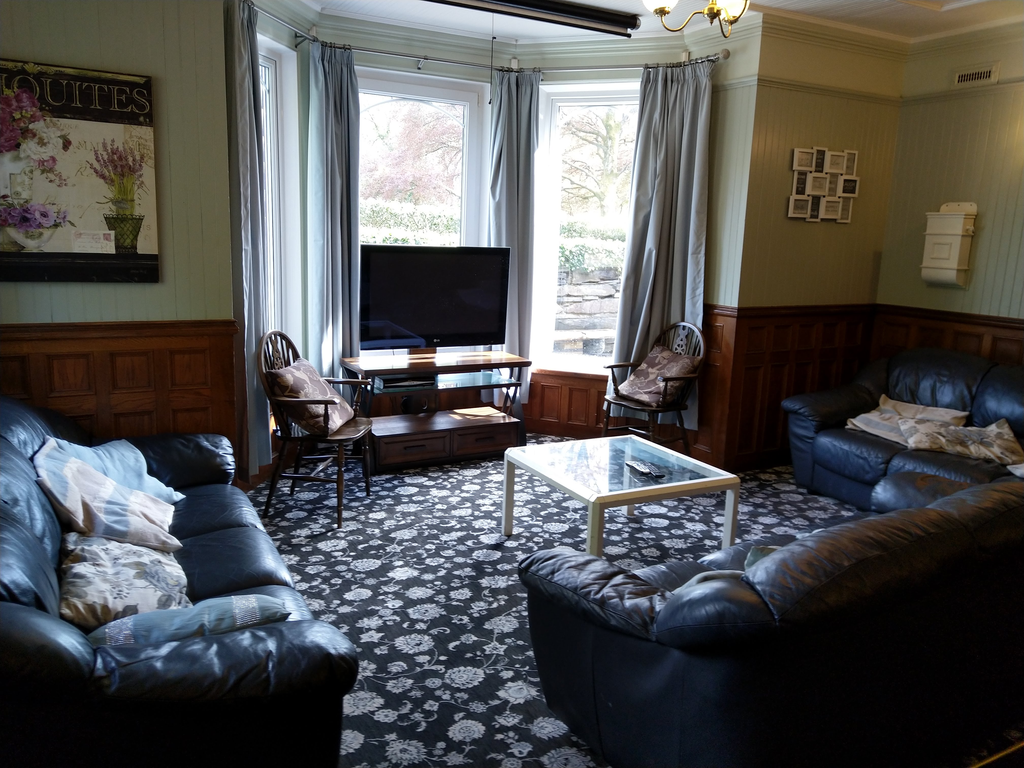 Three large leather couches create a bay sitting area in the picture window of the living room. TV has SKY package complete with movie channels for your viewing pleasure. Tasteful decor, soft cushions and coffee table to help you relax after a busy day. Books for your reading are available on the Welsh dresser. The living areas all close at midight to ensure a quiet house for the comfort and benefit of the guests and household.